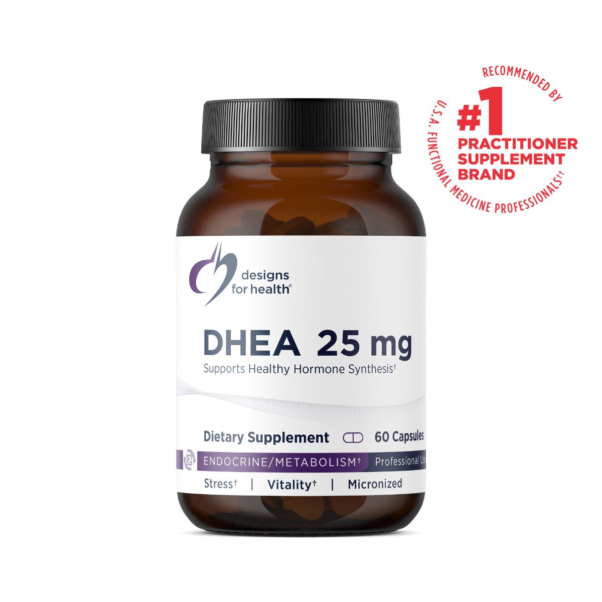 DHEA 25 mg supplies 25 mg of dehydroepiandrosterone (DHEA) per capsule for the synthesis of important hormones and for a variety of potential physiological responses, such as healthy aging, ongoing energy and vitality, and a balanced stress response, as well as muscle integrity and fat metabolism.
