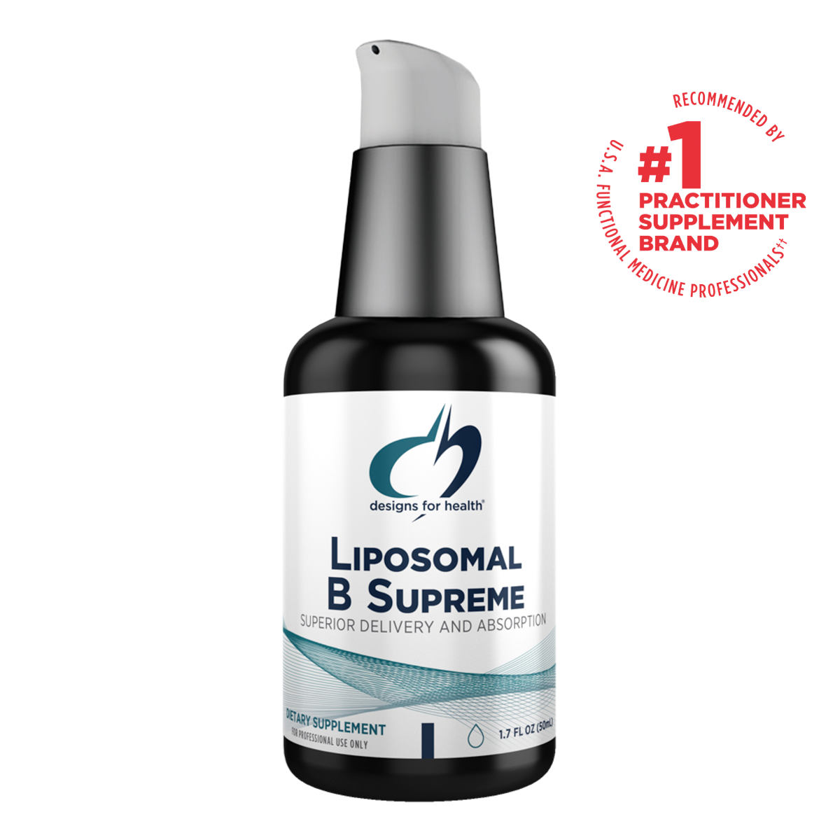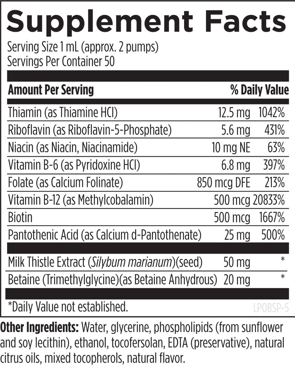 Liposomal B Supreme is an innovative B-complex product formulated with liposomal technology for optimal absorption and bioavailability. Each 1 mL serving (approximately 2 pumps) of this mildly citrus-flavored formula provides targeted amounts of the highly bioactive forms of thiamin, riboflavin, niacin, pantothenic acid, vitamin B6, folate, biotin, and vitamin B12. Betaine (trimethylglycine [TMG]) is included to support methylation. Milk thistle is also included to promote bile flow. Liposomes are spheres made of phospholipids that bond easily with cell membranes, facilitating superior intracellular nutrient delivery and absorption.
